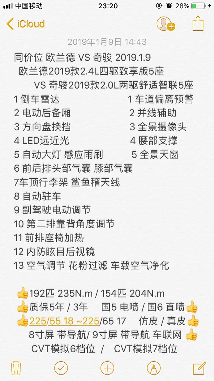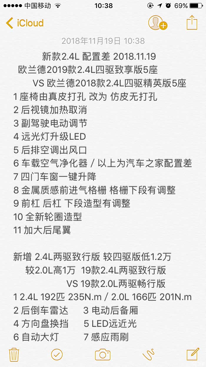 这个是自己备忘录记录的 19款欧蓝德 和18款欧蓝德 差异明细