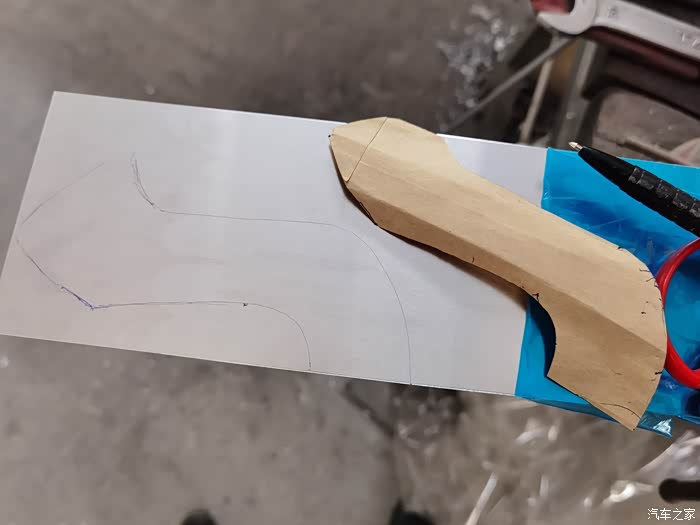 找来薄铝板,厚度约0.8毫米,按纸样的轮廓划线。