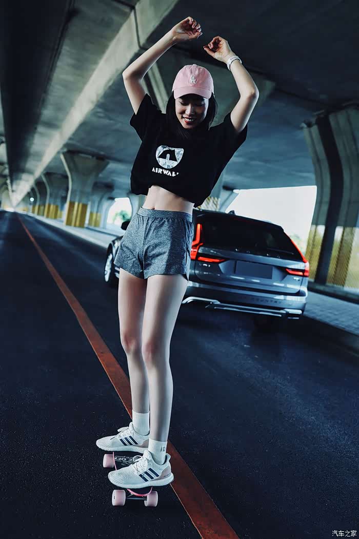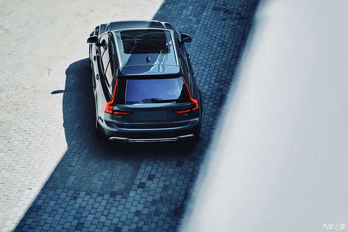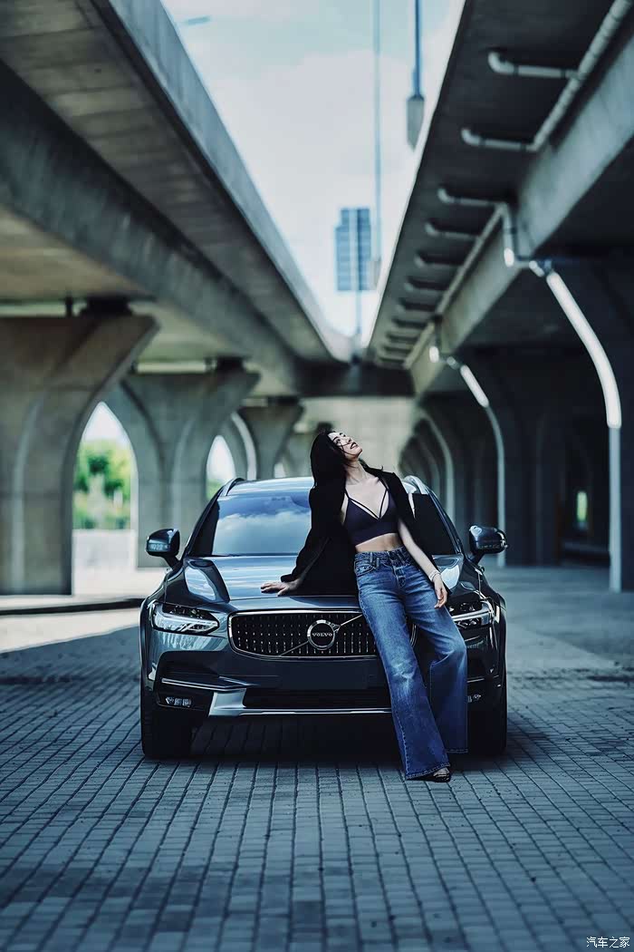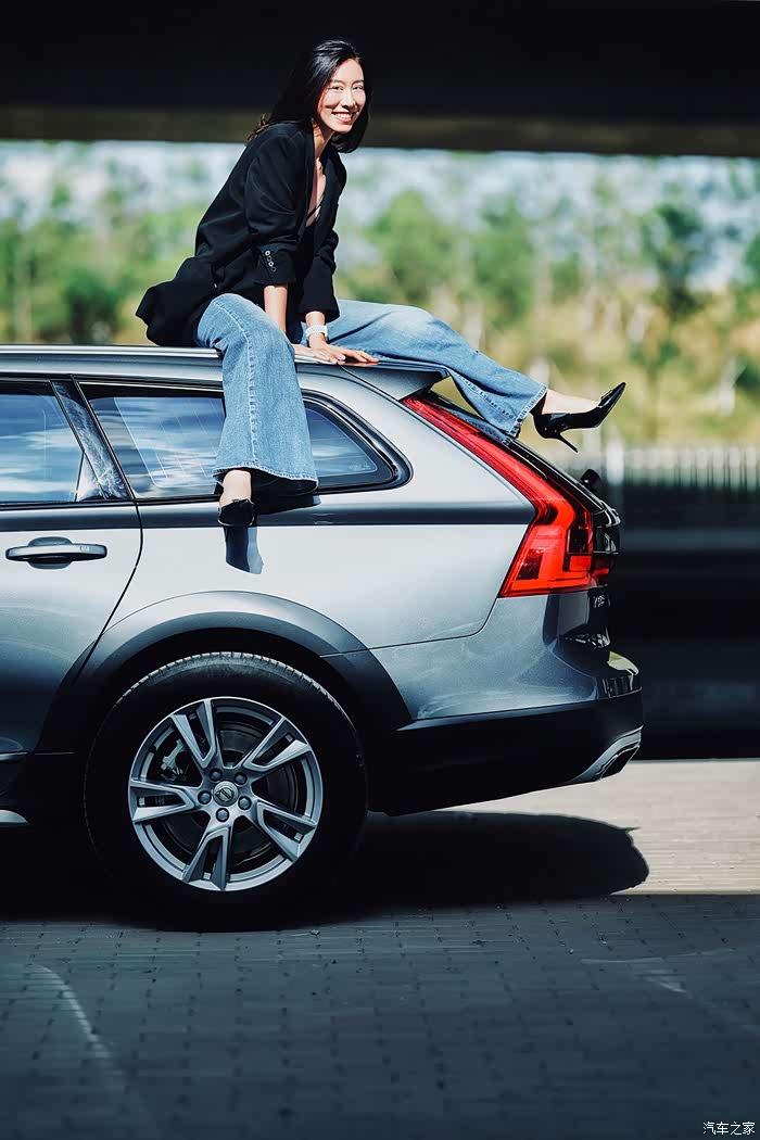 小师妹登上车顶晒太阳,V90cc侧面线条平直有力。