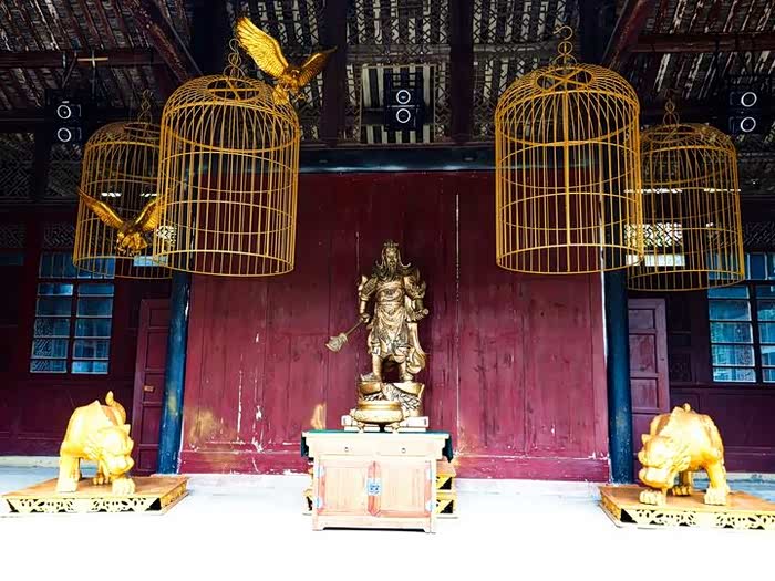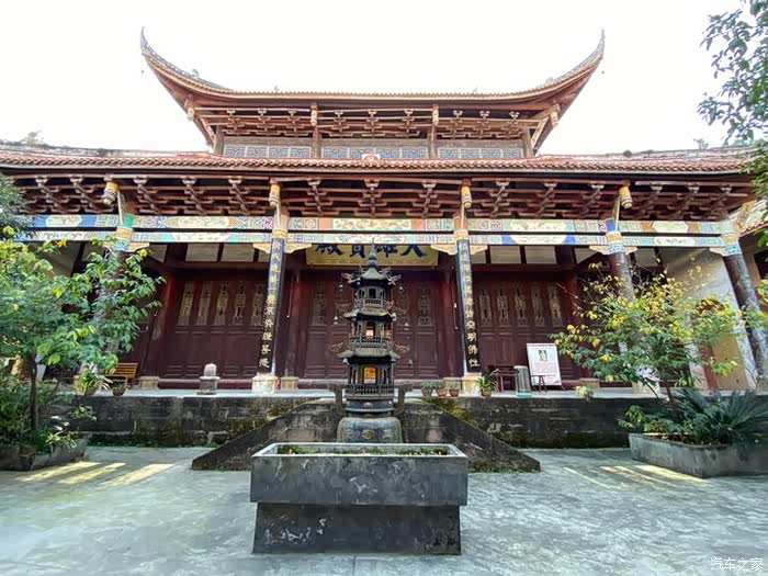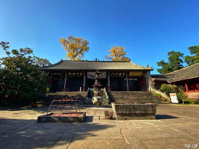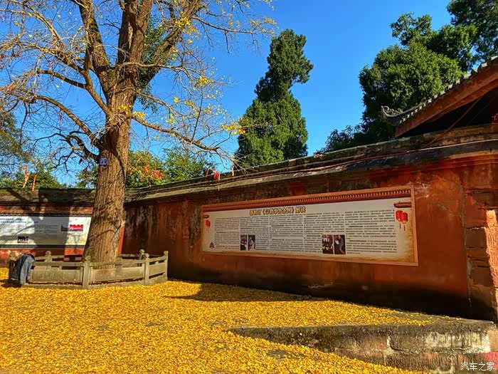 午后的阳光照在古刹的屋檐上,原本锈迹斑斑的古刹,顿时金碧辉煌。门前左右对称的两颗千年银杏数,就像是两位虔诚的信徒,守护者云顶山的一片安宁。一树黄金甲,万枚玉扇生。烈焰燃相城,堪与芳菲争。这大概是成都最美的一抹秋色了。