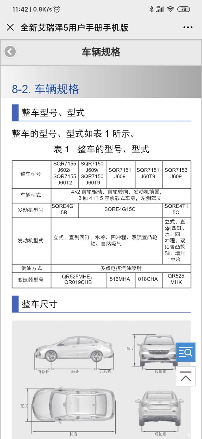 1.先确定要什么样的车。车型19款艾瑞泽5Pro自动青春指导价69900那款,整车型号要SQR7151J60T9(CVT18变速箱),参考说明书车辆规格那一页(见图)。颜色我喜欢红色的,老婆要蓝色的,最终选择蓝色的。