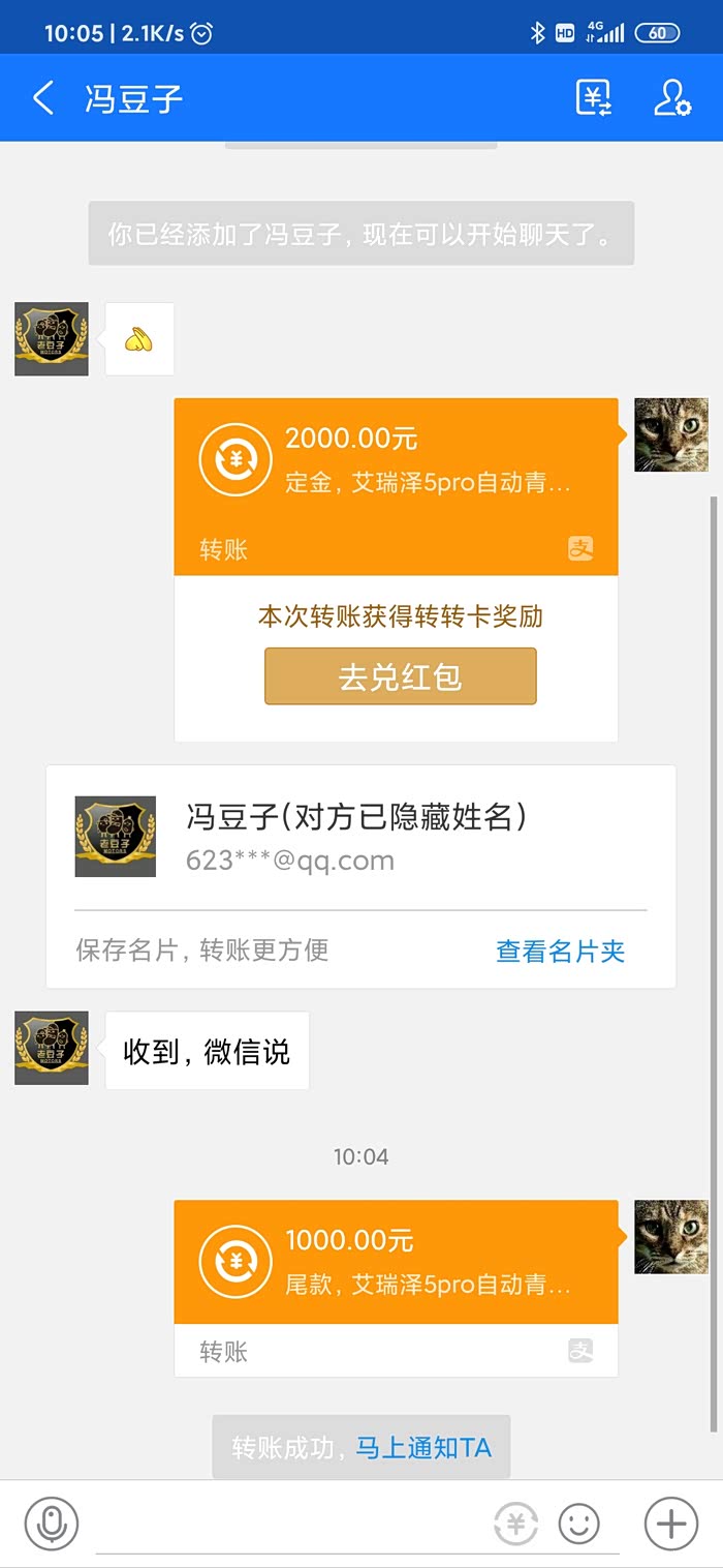 2.带着这个需求,加了老豆子群的吉吉国王微信,问他有没有我要的车,整车型号SQR7151J60T9(我已经记熟),蓝色的。起初他那是没有我要求的车型的,不过过了不到半天,他说给我在本地找到一辆,型号,颜色非常符合,日期新鲜,还发参数图片给我了,而且商业险还能自己买,只用在店里交购车余款和强险意外险,我不禁直呼牛批!!马上飞了2000定金给他,约定周末在本地(安庆)提车。这下不用去芜湖提车,虽然省了路费,但却也与传说中的大宝剑失之交臂了。
