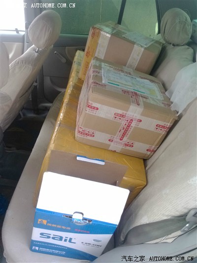 满满的后座全是快件,最下面的大箱子是刘学明发来的,右上面的是汽车配的充电器,旁边的是洗车机水泵,吹风除尘机,等等小配件,还有一个箱子在副驾驶座位,是一盒LED灯泡,还有顺路买的风帆电瓶大箱子旁边,一瓶玻璃水在脚垫上。下面是刘学明家的东东500块钱的,,呼呼![]()