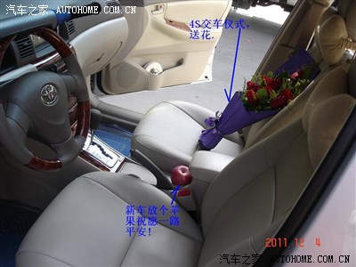 12月4号上午10点到了4S店,车已经停在交车区了,上去细详查看了外观,发现牛头角LOGO的那条镀络条有点用手擦不掉的花纹,后来销售开去用一些什么水可以擦掉了,发动机盖打开查看机油尺没发现有黑色的,个个组件都有作过的检查合格的记号,核对车架号,保险,税票,发票,一一查看,真皮座椅手工可以,仿桃木方向盘手感也不错的,玻璃是AGC的……,目前只有保险的标贴,还欠验车标和环保标贴,要装铁牌时才一起给,木办法啦!没给钱我说了算,给了钱他说了算! 开了
