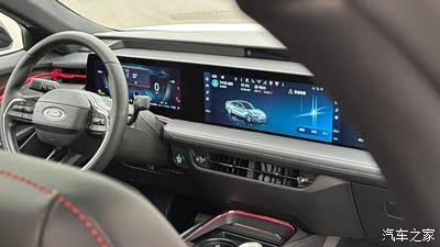 车内三辐式多功能方向盘、12.3英寸的全液晶仪表+27英寸的大连屏组成的贯穿式一体屏,彰显其豪华科技感,同时搭载福特全新一代SYNC+2.0智行互联系统以及高通骁龙820A车规级处理器,进一步提升整车的科技感,中控屏以及门板处均采用了软性皮质包裹,提升车内的档次感。