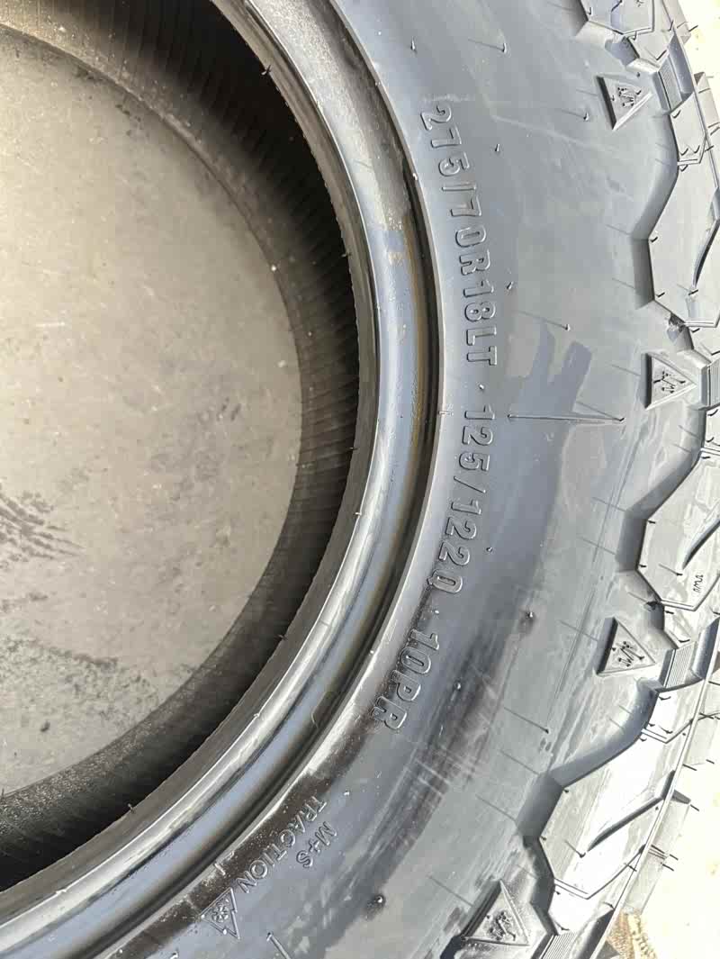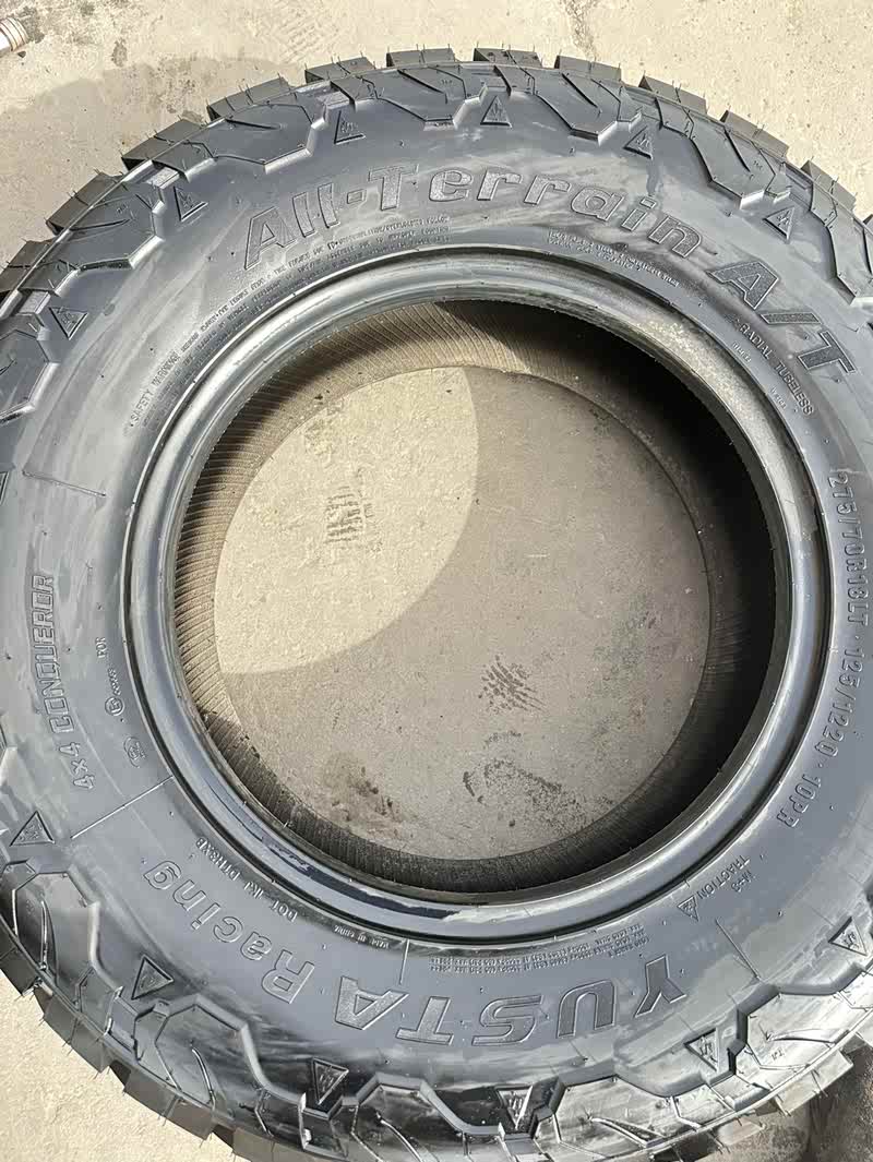 铁骐品牌轮胎,275/70R18AT,总共四条 适合牧马人4XE、途乐、角斗士、坦途等车型。只跑了两趟市区就拆下来了!胎侧白字,正品保证,无伤无补,,没有划伤。需要的朋友可以联系我。