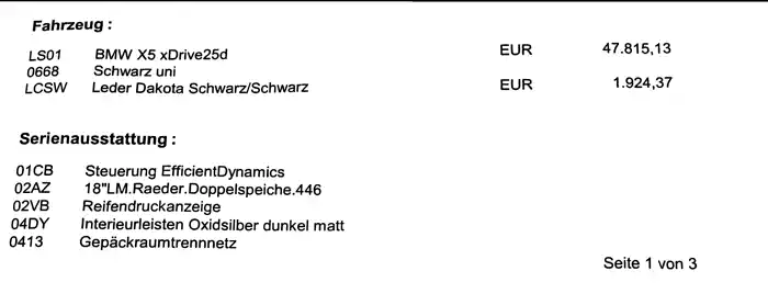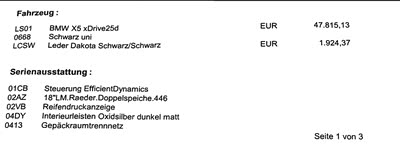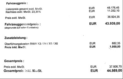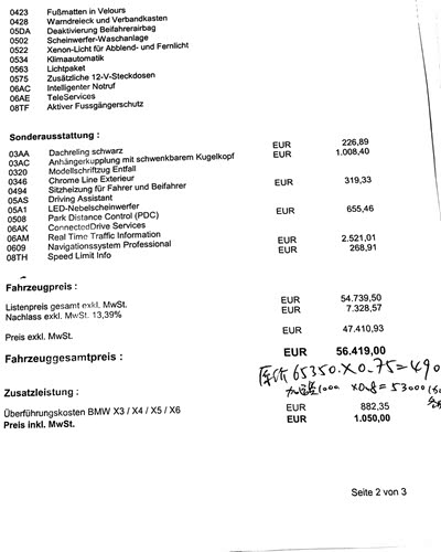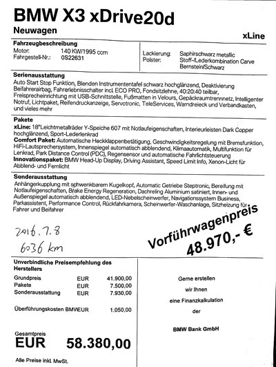 销售员从系统中调出了一辆X3,7月份注册的车,2.0T柴油发动机,里程6000公里,xLine的选装包。加上各种选配原价58380欧元(折合437671元),准新车公开价格为48970(折合367125元),初步协商后的价格为45000欧元(折合337 362元),其中有1000欧元是从慕尼黑过来的运输费用,稍后看能不能砍掉一些。销售说车还在他同事那里使用,约好了下周碰面试车,再确定最终的价格。配置清单里面有一项是拖车的钩子,这个东西要1200欧元,但是对于我来讲是个然并卵的东西,不知道能不能给卸掉减钱。。。