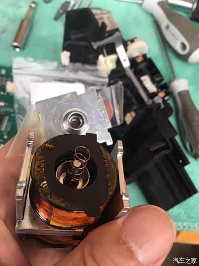 第二天早上起床,准备出去拜年,上车启动后挂倒挡,额?又推不动了,什么情况?滑道润滑油不够?滑道磨损?试了半天,还是不行,只好放弃,换老婆的车出门拜年,路上恨恨的想,我还不信修不好,明天慢慢收拾你,第二天已经是非常熟练的拆开电子档总成,经过观察,发现和第一次故障一样,挡块动作不到位,继续拆散总成,滑道油脂正常,也没有磨损,这说明卡顿的故障点不在这里,但这个机构其实很简单,没有别的地方可以造成卡顿了,那会是哪里呢?突然想到,难道是电磁阀阀芯?用手推动阀芯,没有感觉到卡顿,伸缩自如,顺畅的很,可是如果不是挡块、阀芯,那就没有任何机械部分了,以往的设备维修经验告诉我,还是要拆开阀芯看看,眼见才为实。