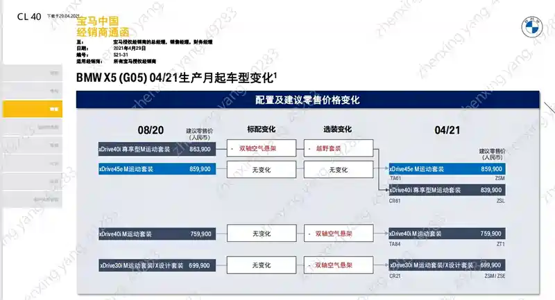 宝马X5 最新价格及配置变动 删除 推荐精华 置顶 取消置顶 关闭回复 打开回复 推荐编辑 楼主禁言 移动帖子 重置头像 操作记录 大滾筒先生 0浏览 · 2021-04-30 13:29 刚刚收到销售打来的电话,之前了解到的4月份开始不再标配空气悬挂的40i尊享最新价格已经出来了。对已经订车,犹豫订车和对宝马之前减配但没有及时调价等待的车友是个好消息。 举报 打开汽车之家 阅读体验更好 精彩热门 更多 凯迪拉克XT5提车分享 方程豹豹5射灯方案 极氪001提车作业分享 骓1200使用体验分享 摩托车运动相机怎么选 第一台弯梁的诞生 查看更多 打开汽车之家 互动体验更好 微信好友 微信朋友圈 新浪微博 QQ好友 QQ空间 取消 相关推荐 加载中