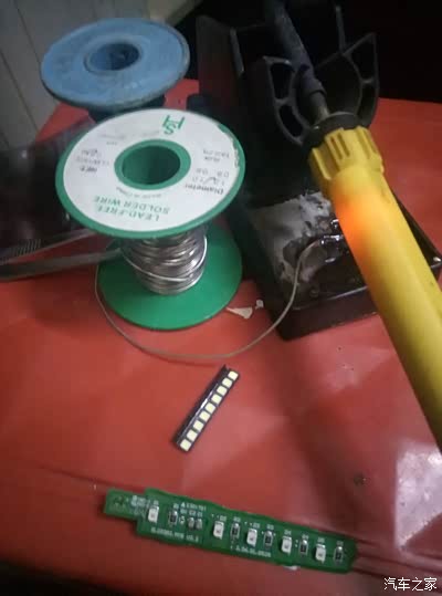 拆出来后就开始改灯了。注意的是要用万用表打二极管测量档测正负先,正负对LED会发光。新的灯也要测下,或者用观位法,灯的正负有一个角是有一个小缺角的。分清就行,还有焊工,不行的话拿到手机店,每个焊脚三秒内就焊完,不然有可能会损坏LED灯体。尽量用专用电子维修的调温电烙铁,静电也不大。我无所谓,我是用普通的电烙铁。还有注意检查虚焊,焊好再用万用表测一下。