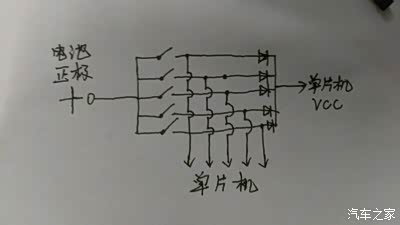 遥控器肯定不能用长电,不然电池用不了几下就没了,于是设计了一下的按键电路,用二极管分离按键并对单片机供电,这样只要松开按键,就断开了电源。按一次按键算0.5秒,那么一个小时的供电量能够按7200次。正常的使用频率用一两个月应该不成问题。