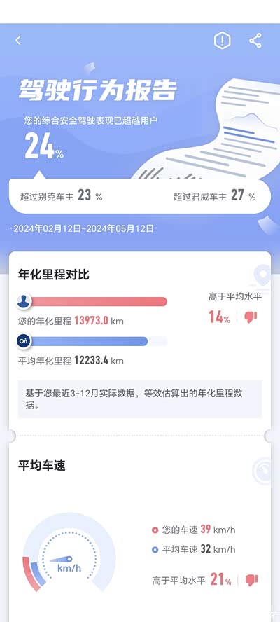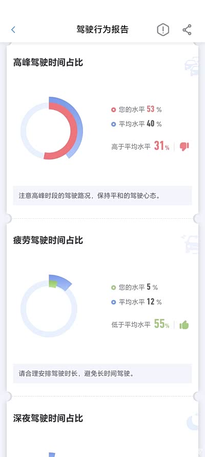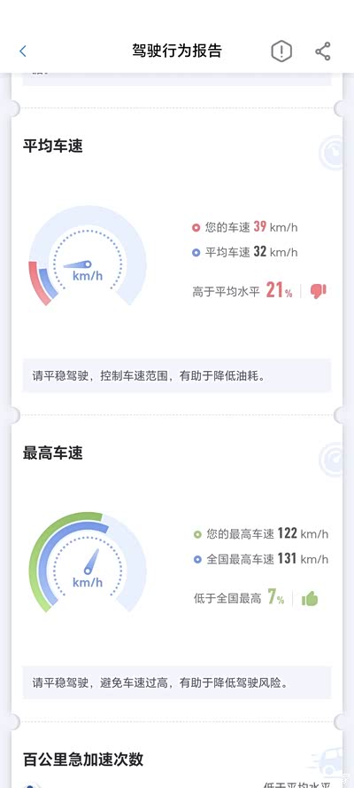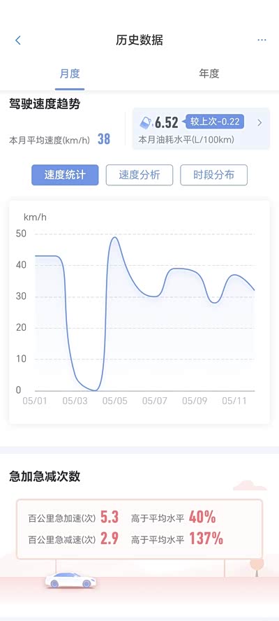 但是从我的驾驶行为报告来看,在省油方面我仍有很大的进步空间,因为我的驾驶表现仅仅超越了24%的用户。从具体评分来看,我的主要驾驶坏习惯为急加速和急减速的次数过多,驾驶速度忽快忽慢,再就是高峰时段的驾驶时间确实过多,导致了油耗的增加。