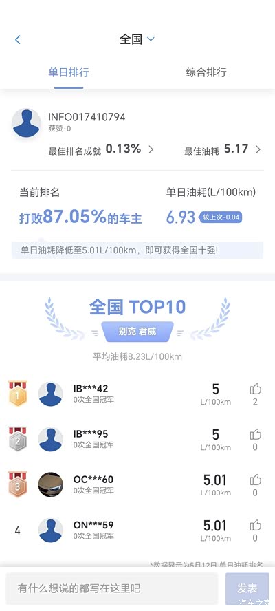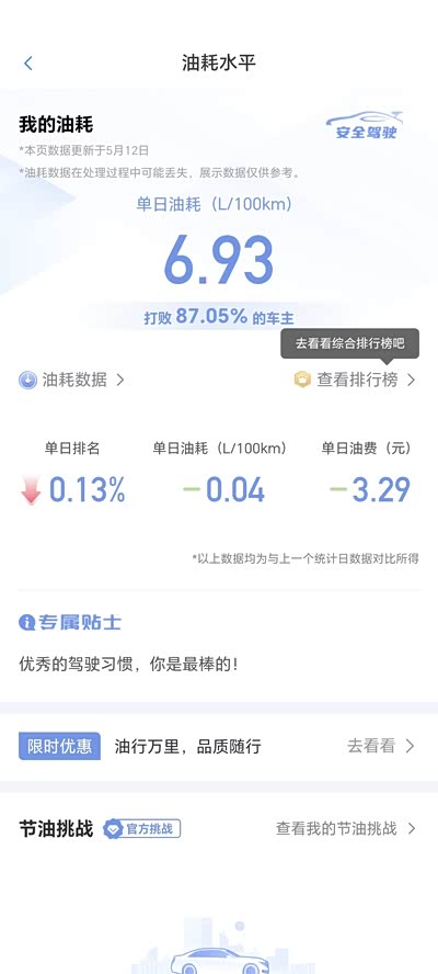 大家可以看一下我今天的单日油耗,是6.93升,接近七升的油耗不算低,但其实也算不上高,但我的油耗数据却超越了87%的君威车主,这代表着我开车还算比较省油。