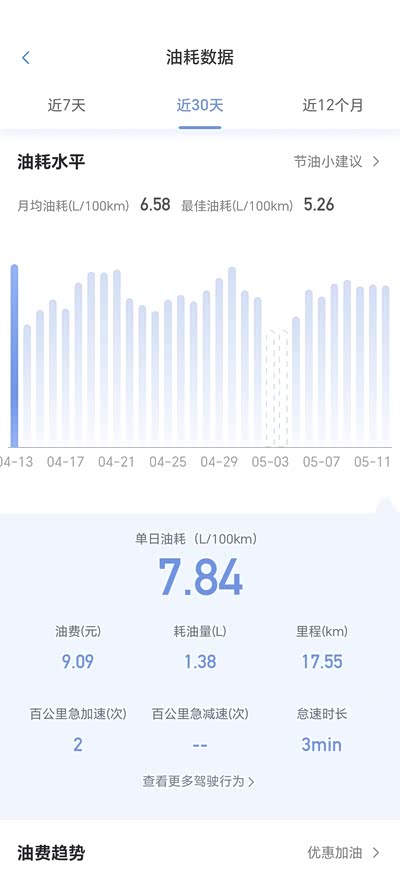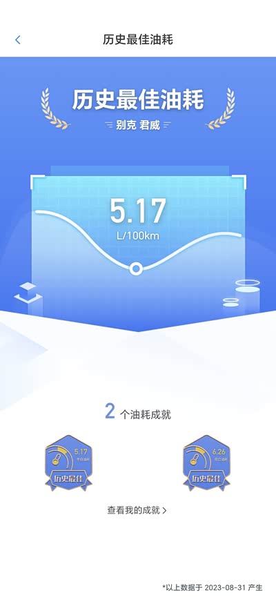 驾驶君威以来,历史最佳油耗为5.17升,我自己都不知道这个油耗是如何开出来的。不过确实有个别情况下油耗很低,近30天我的平均油耗为6.58升,最低油耗为5.26升,这样的油耗绝对能够比拟以省油著称的日韩车系。
