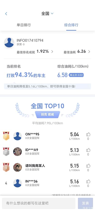而我近期的综合油耗则为6.58升,排名超过了94.3%的君威车主,这意味着我也能够堪称是黄金右脚,开车还是比较省油的。