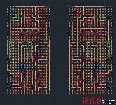 这个是用CAD画的,为了方便焊接,以免焊错线,我把元件在洞洞板上占用的格数及位置画了出来,右面做了镜像,因为焊的时候是在板子的背面完成的,黄色的是焊接过线,红色及其它为元件、电源模块及跳线等
