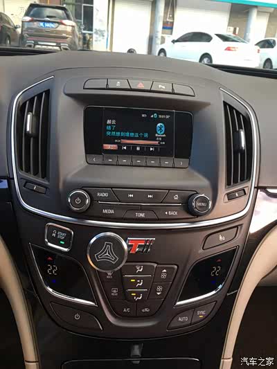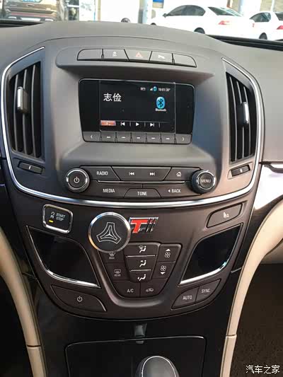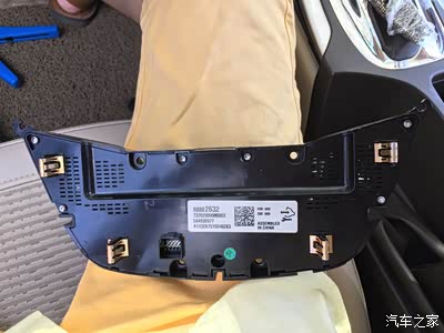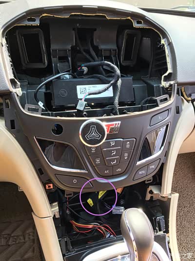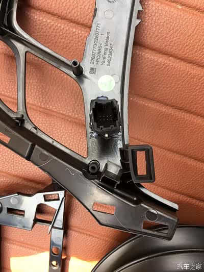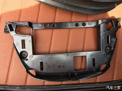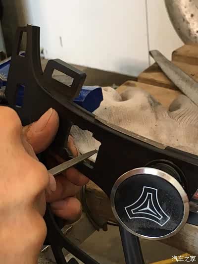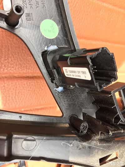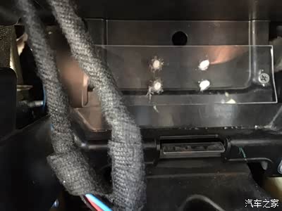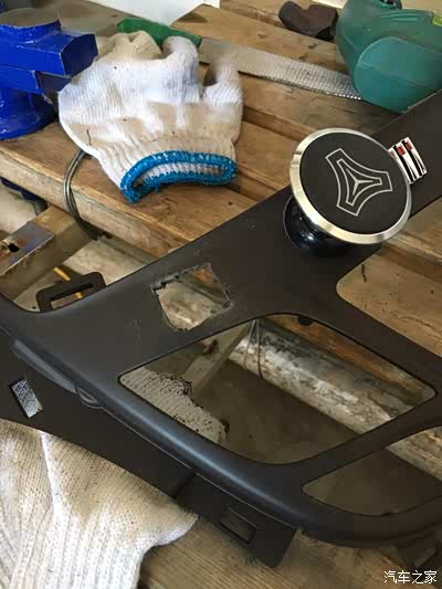 左面这里本来有个孔,整个后面这个固定板就是延用老款君威的,这个原车调配按钮的孔也就存在着,但我的按钮孔位不对着这个孔,也就把这个孔的边缘切开一块儿