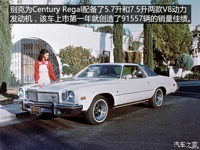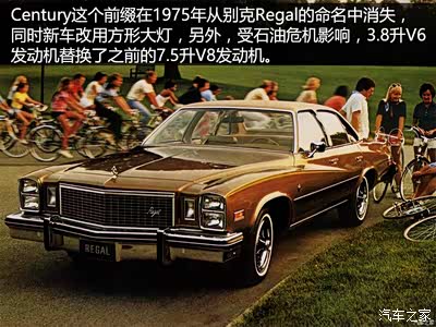 从1975年起,Century这个前缀悄然消失,Regal真正成为了独立车系,除了不再提供7.5升V8发动机以外,还将入门级的动力系统换成了3.8升V6发动机,最大功率112马力