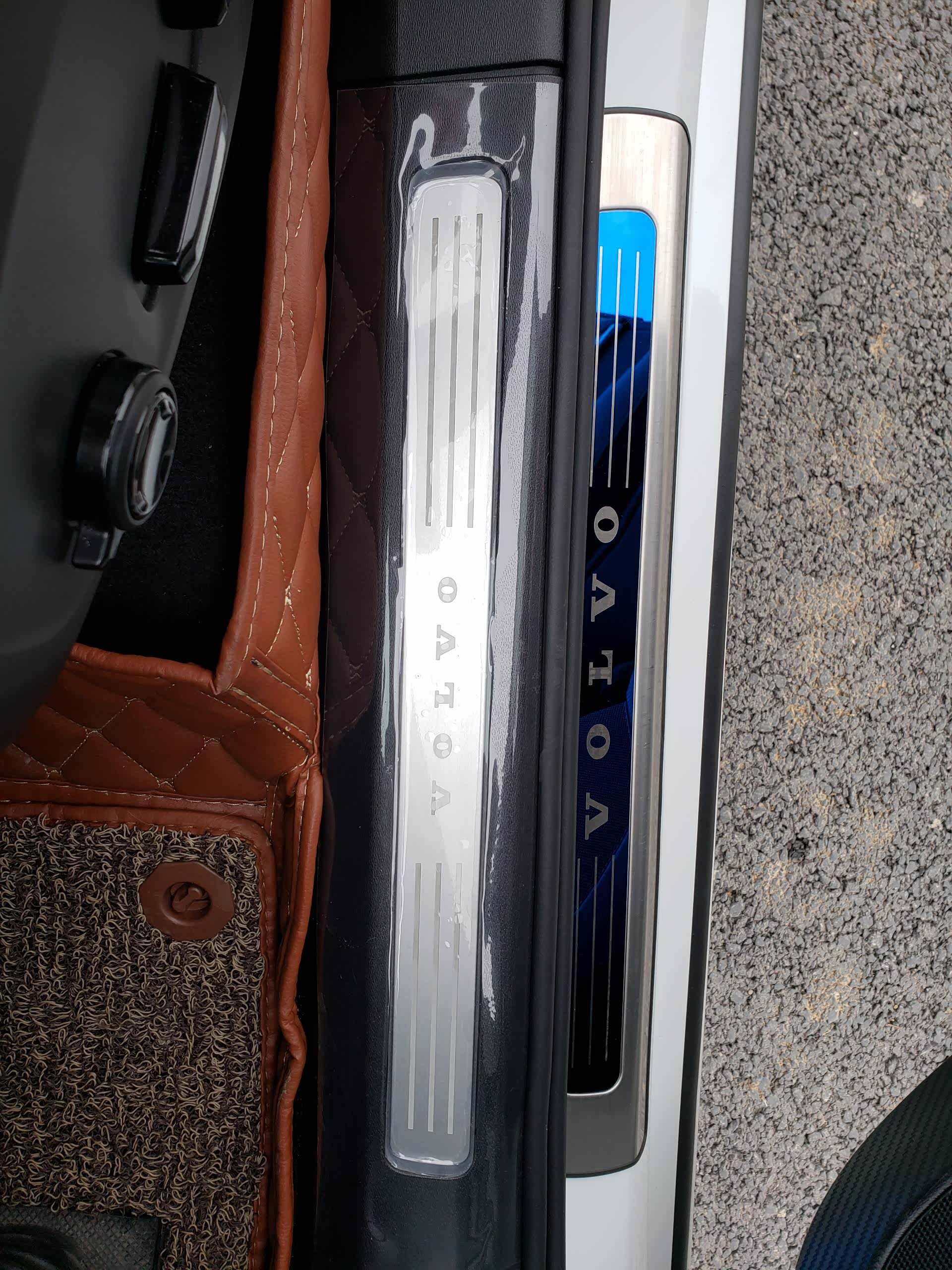 这个是自己最满意的地方,碳纤维材质的,字是另外贴上去的,四个车门都需要贴下,因为原本皮质的只要鞋子踢在上面,非常容易把皮拉毛,毛掉了就没办法修复了,我正驾驶就有一条鞋子踢的印痕,所以新车到了就贴,不然车门没过多久基本就惨不忍睹了