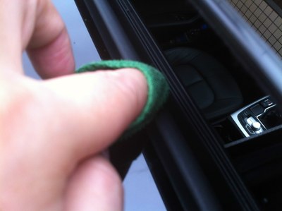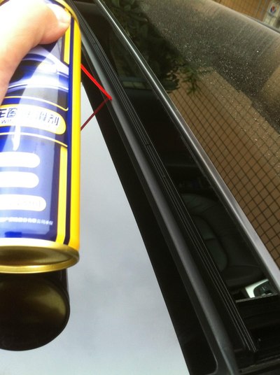 5、将天窗回到最大翘起位置,将中间的胶条清洁并养护,品牌如图,如果家里条件好可以买宝马的车窗胶条专用养护剂,本品亦可,某宝有卖。同样,不是完美主义者本步骤也可忽略。