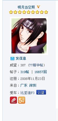 这个头像为火影忍者人物“宇智波鼬”的就是明月当空照了,原为F3认证车主,换凯美瑞后不再改认证,跟杰仔一样。