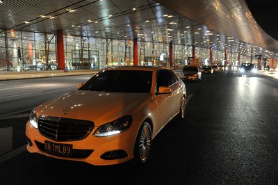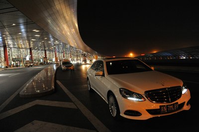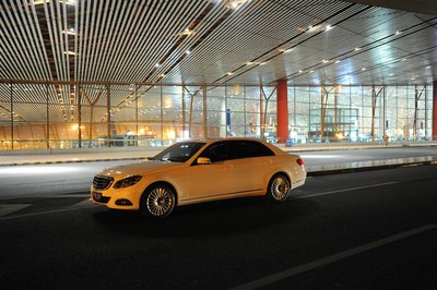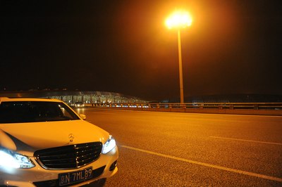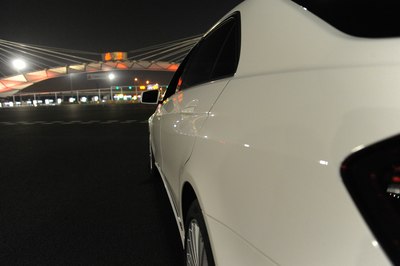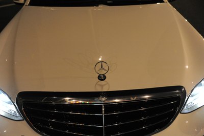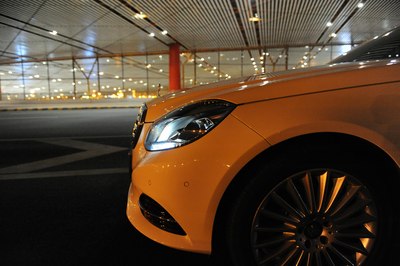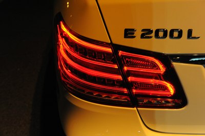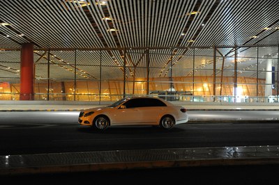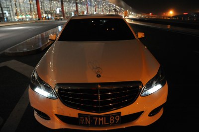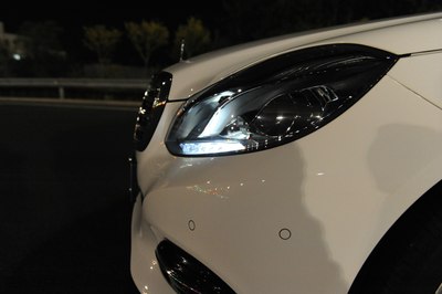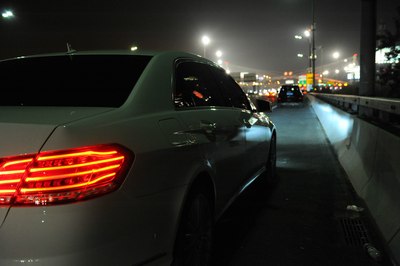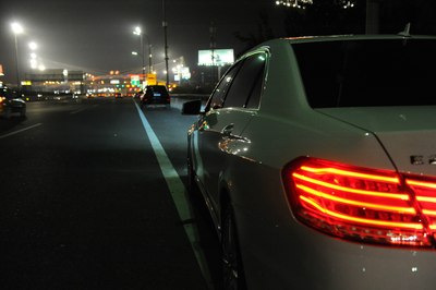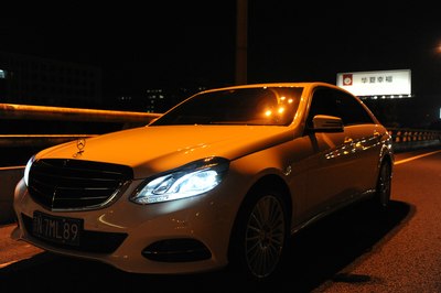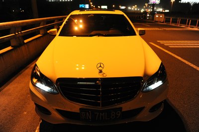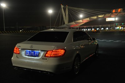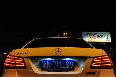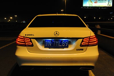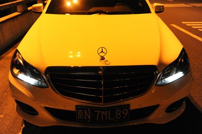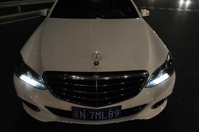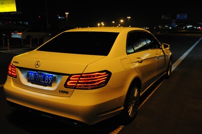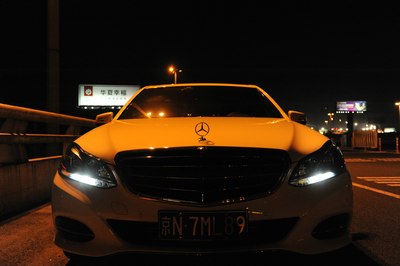 【灯光洒在奔驰车上显露出金黄色,冰冷的车牌灯更是点睛之笔】