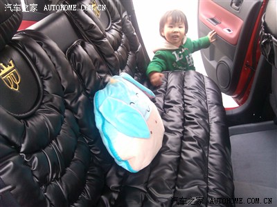 丫头非要照一张,,,顺便看下座包套,神网买的,质量不错,效果也不错,尺寸定做的刚好,540大米。小毛驴靠垫,呵呵,“驴途平安”。