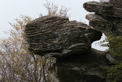 这块大石头是悬空的,哪也没挨着,而且底下有小石块垫着,真是感觉一推就可以推下去……