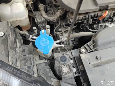 今早开车出门清理玻璃时发现玻璃水用完了,前段时间天冷加了去年剩下的半瓶过冬用零下30度的玻璃水,后备箱有刚买回来的就打算把它加上。打开机舱以后,一眼就能看到加注玻璃水的地方,一个蓝色的小盖子非常醒目。
