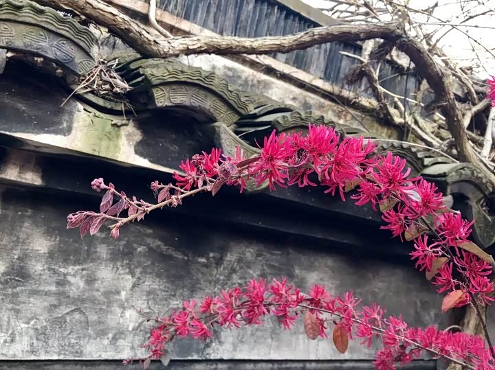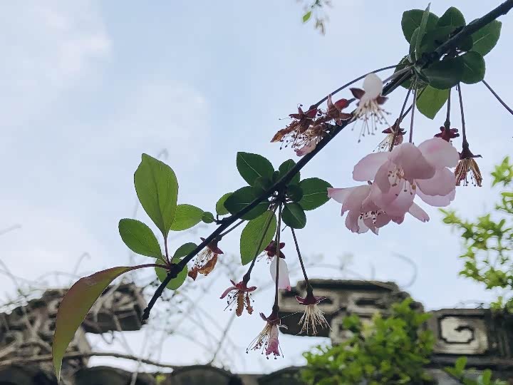 跃上围墙的垂丝海堂,依然美丽绽放