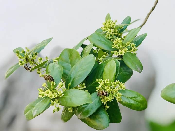 勤劳的蜜蜂在翠绿的海桐上采蜜,他们也被这清新绿叶,花香四溢的海桐吸引了
