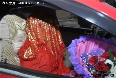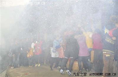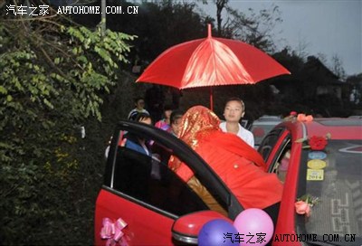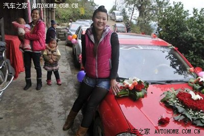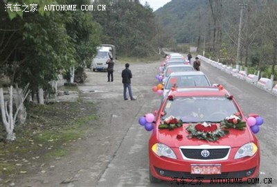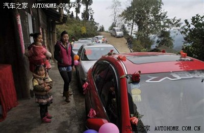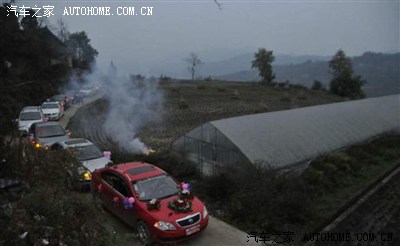 马上到了,开始放炮了,红车顶那依稀的人影看见了嘛,魔力般的天窗..... (一般都是摄像的坐有天窗的轿车或者越野。炮手或者称炮工都在皮卡的斗里扔炮。回的时候那个皮卡拉嫁妆,箱子之类的。炮车排第一摄像走第二。婚车走第3后面一排拉伴郎伴娘的酱油车。)