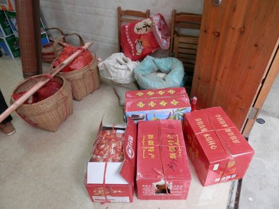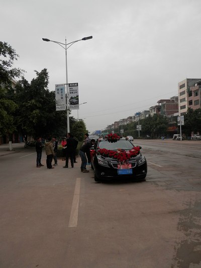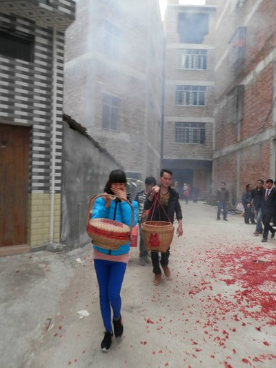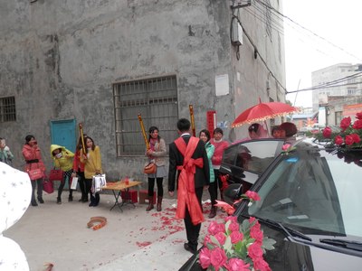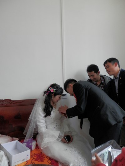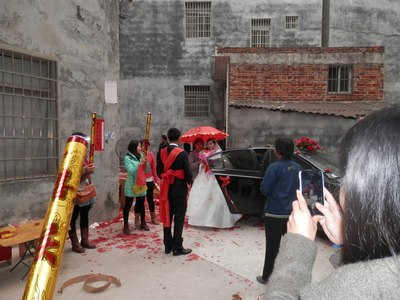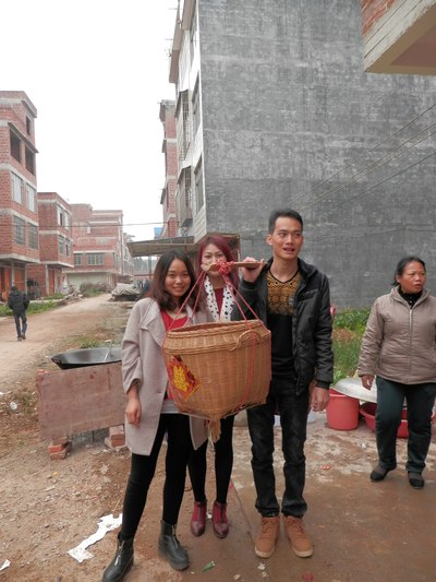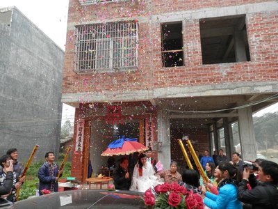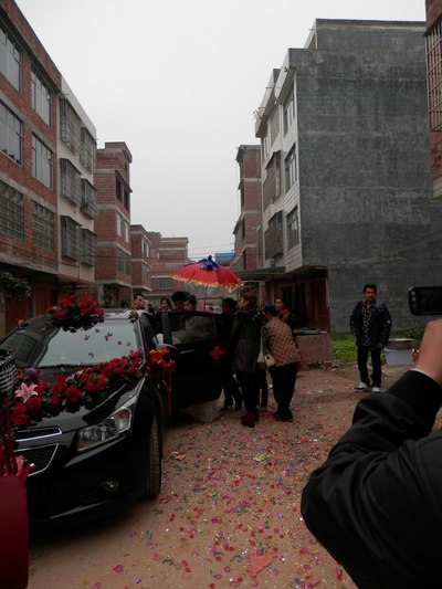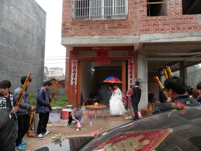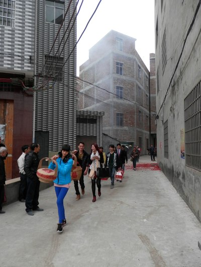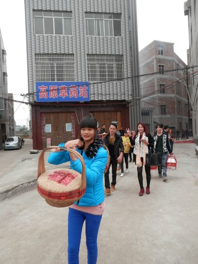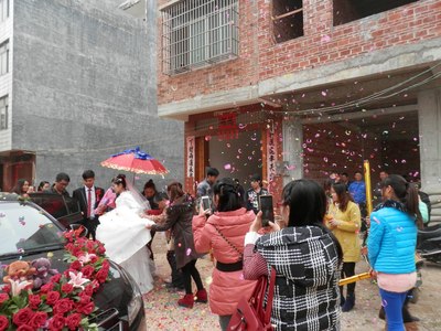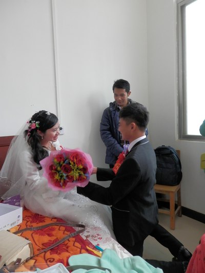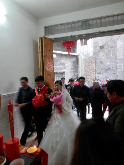 出发接亲所准备的东西,两担糖果之类的,包括橄榄,红枣等,还有两只鸡,两瓶酒。。。,总之都是双数,意为好事成双,成双成对。结婚前要去一次,双方家长见面,女方家长将女孩子的生辰八字用红包包好交给男方回去选日子。商量一些事情。之后就是报日书,也就是男方将选好的良辰吉日送至女方府上同时再次商量一些事情。一些礼物也是必须的。这个是非常讲究的,即使是自由恋爱,到了谈婚论嫁的时候也要请人“行媒”也就是负责男女两家之间的意见传达,角色非常重要,新婚夫妇与我都是高中同学,而且新娘子与我还是同村的,大家相互之间认识,而两家语言又不相同,恰好我熟悉两种方言,又相熟,所以就是由我来担任这个媒人了。我也是美丽的第一次,主要还是要多沟通。太多的习俗就不一一阐述,很多地方都是大同小异,现在社会开放,也木有那么多之前的繁文缛节,大家沟通协商好,开开心心把事情办好就好。不同意见求同存异。关键是新郎新娘要情投意合。