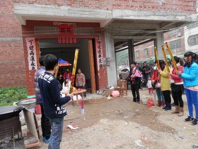 新娘出门前要拜神,感谢娘家的养育之恩,神明的保佑之恩。礼炮手严阵以待。