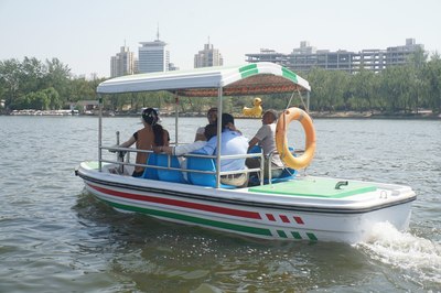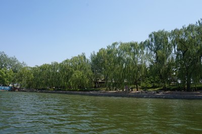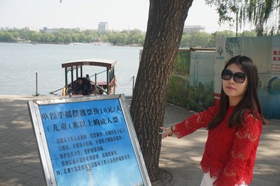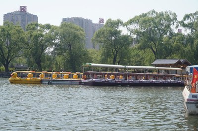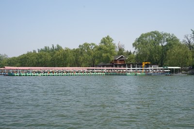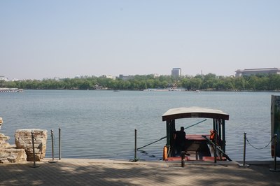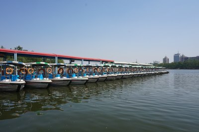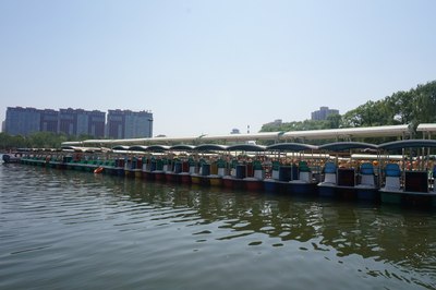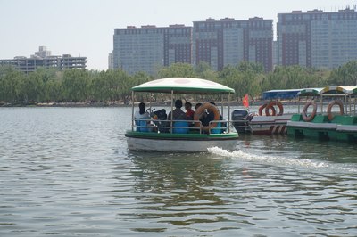 公园门票两块,跟免费差不多。这是公园南门,进去走两步就是码头,本来说脚蹬船就可以了,结果一问:今天风大,只能来电瓶船,押金300…我怎么没觉得今天的风有这么喧嚣啊~算了,干站着太热了,赶紧上船吧!