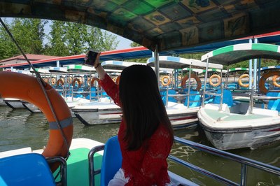 返回码头,一个小时时间过的也快。曾经荡起双桨的时代已经一去不复返了,以前划船还要点技术,划船划的好也是点恋爱的小资本,现在直接都电瓶船了,懒人吃货的福音但是也少了点情趣,不过好处也显而易见:我能直接到第二排媳妇旁边拍照不管船,方便~