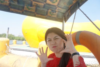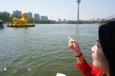 又回到黄鸭子了,媳妇继续搞怪。这个鸭子离我们当初看见的位置已经移动出好远的距离了。