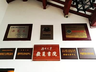 大厅中央悬挂两块鎏金木匾:一为“学达性天”,由康熙皇帝御赐,意在勉励张扬理学,加强自身的修养,原额被毁,1983年依康熙字迹重刻;二为“道南正脉”,由乾隆皇帝御赐,它是皇帝对岳麓书院传播理学的最高评价,表明了岳麓书院在中国理学传播史上的地位,此额为原物。