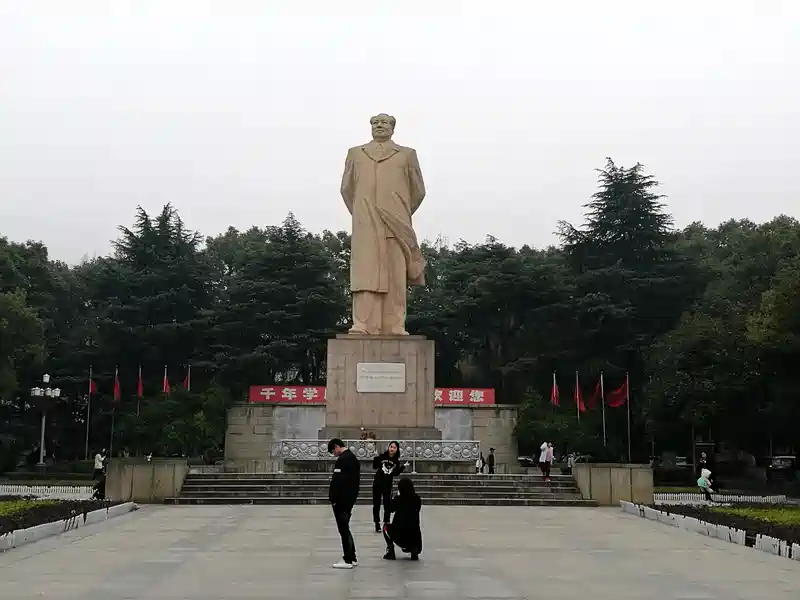 沿湘江西侧的潇湘中路右转进入牌楼路直到麓山南路,迎面是伟人雕像,雕像面向湘江。