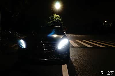 全LED的智能照明,开了这功能,强制开了远光灯会自动根据路况调节,远近高低宽度都是自动,在没啥路灯的地方效果尤其明显,前车稍暗,两侧亮,或者经过路牌,大灯自动照亮路牌的地方。但是智能照明模式下不能强制一直开远光灯,在有时候天气不好或者对车开远光灯想还击的时候就不是很方便,可以通过comand系统关掉,但在行车过程要关就比较麻烦。