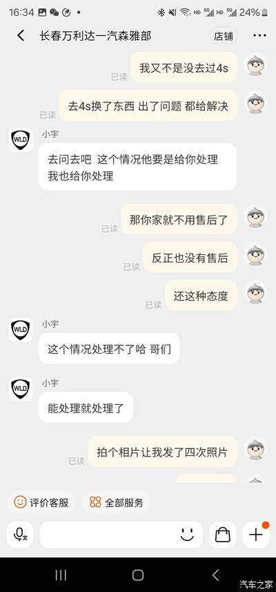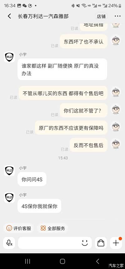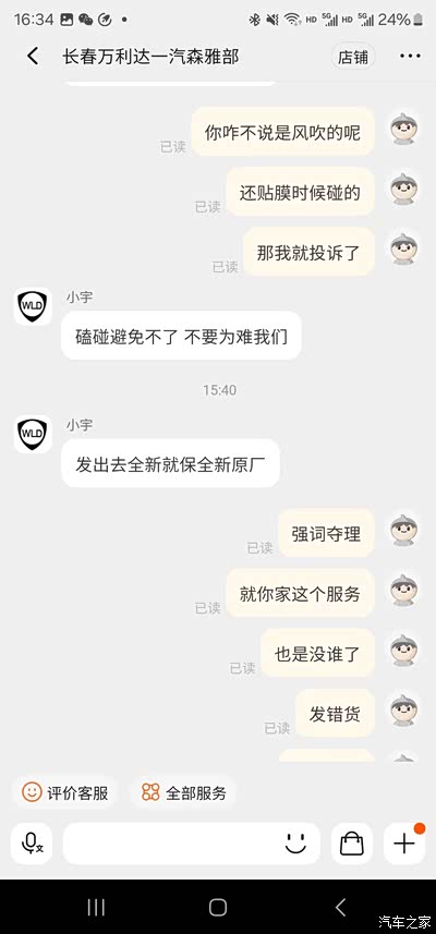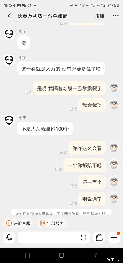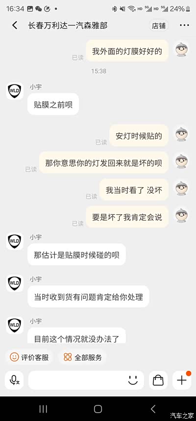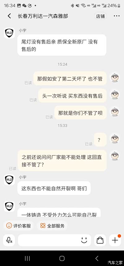 年初收了一辆马6瓦罐,开始了整备之路,觉得他家还不错,买了好多配件,中途有发错货、发错地址的情况,都能原谅。但是今天我忍不了了,必须曝光他家,1月份买的尾灯,美其名曰原厂,我也信了。买回来贴的灯膜,一切OK,前几天发现灯壳裂了,拍照给卖家,拍了足足有四次,终于能看见了,然后说我自己弄坏的,我说灯膜一点痕迹都没有,灯是怎么坏的,售后小宇态度很坚决,说我人为破坏的,他们只保证原厂,不管质量,也不包售后。那么咱们再买配件还有保障吗,不敢想,一句只保证原厂就大过天了。虽然东西不贵,咱们也能换的起,就是觉得现在的网店可能是被养肥了,财大气粗,也不差这一次差评,我说要投诉,人家根本不理会。请车友们绕道,别再去这种无售后的商家了。我把聊天记录都发上让大家看看吧,以免大家被坑。