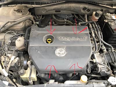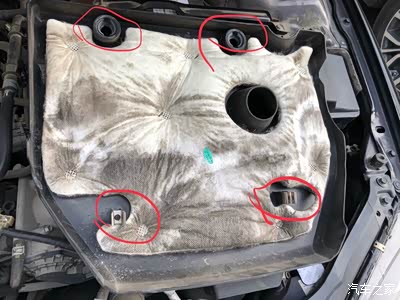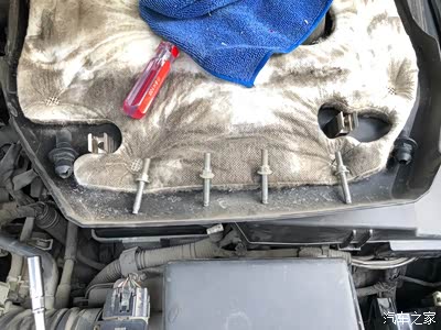 接下来就是开机盖开始更换了,首先要把发动机护罩拿掉,发动机护罩有四个固定位置,前面两个是开口卡子后面是两个橡胶圆孔卡子,双手分别把住护罩前端的左右两侧,向上一抬就起来了,此时再用双手把住后端向上抬就顺利的拿掉护罩了。