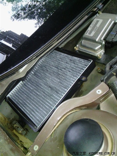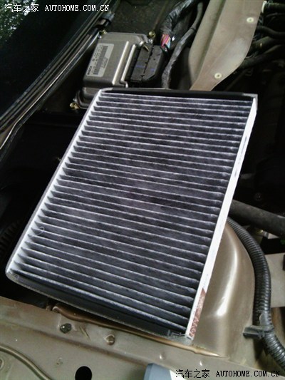 拆出盖板看到原车的空滤芯,有点脏了,不过背面向车内的一面还算干净,灰尘没有透过去)