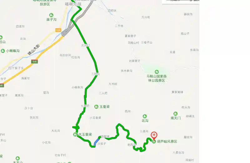 葫芦峪景区位于宁城县小城子镇高桥村,地处七老图山脉,是宁城县西部著名的红色旅游胜地和自然风景区。景区东西长约5 公里,南北宽约3 公里,在深山老林中因山峰环绕状似葫芦而得名。可走G306小城子向西,一路沿着山谷小河边行走,两侧山坡有许多果园,主要是寒富苹果,秋季采摘可走此路,也相对好走。