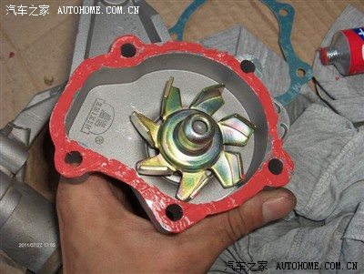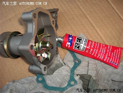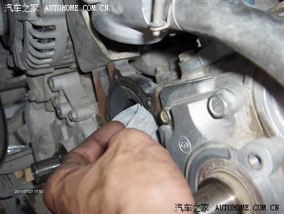 用钢锯片将发动机和水泵结合处,清理水垢和胶痕等,不要挂伤结合面,擦拭干净。然后将新水泵的垫安放到槽内,将水泵结合面均匀涂抹密封胶,然后将水泵安装到发动机上,带上紧固螺栓,均匀对角受力。