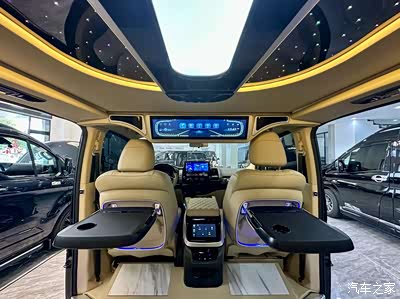 顶部是我们全开模的一个星空顶灯,同时搭配暖色系的氛围灯以及蓝色的氛围灯相呼应。夜间旅途中坐在航空座椅放松,打开灯光,非常有观看星空的感觉。小海狮不像棕咖色很商务,它是很清新的一种感觉。还有一点大家知道丰田海狮像大海狮基本上都是单开门的设计,你们发现了没有,很少有双开门的车子,但是我们小海狮都是采用了双开门的一个设计上下车非常简洁便利。前面是我们固定式的一个液晶电视,一边是速度,一边是时间,中间您能听音乐、看电视,手机投屏、k歌都支持,下面液晶控制屏,控制的冰箱无线充电整车的灯光以及电视还有220伏电源。