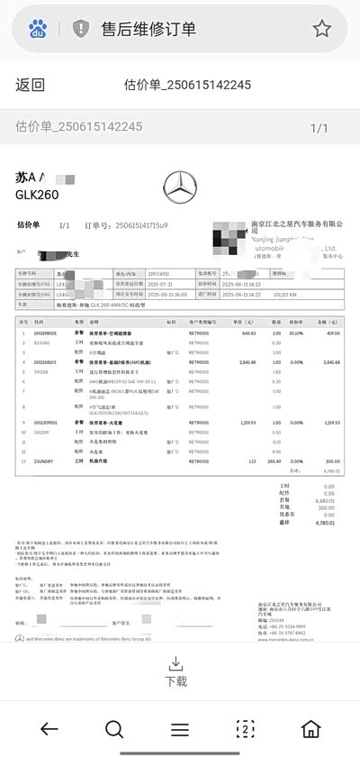 6月 15日去江北的4S保养,B保➕火花塞➕空调滤芯➕升级AMG机油报价还是挺肉疼的,4700多,还好保险在4S买的,有个599抵B保和火花塞,再加个升级机油和空调滤,总计付了1000多搞定。当天4S感觉人也不多,1个小时多点就好了。
