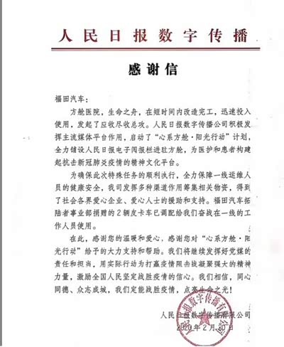 2月20日,人民日报数字传播发来感谢信表示,感谢福田汽车以及拓陆者事业部的温暖和爱信,感谢福田汽车以及拓陆者事业部对“心系方舱·阳光行动”给予的大力支持和帮助。