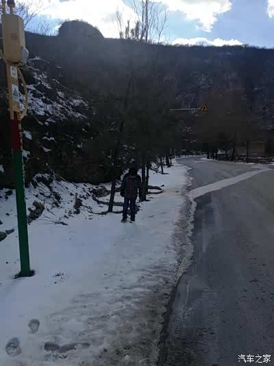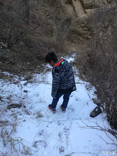 路边的雪还没化呢,儿子下车踩雪去了!