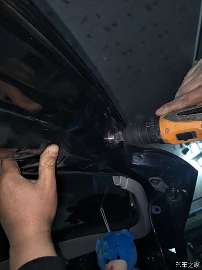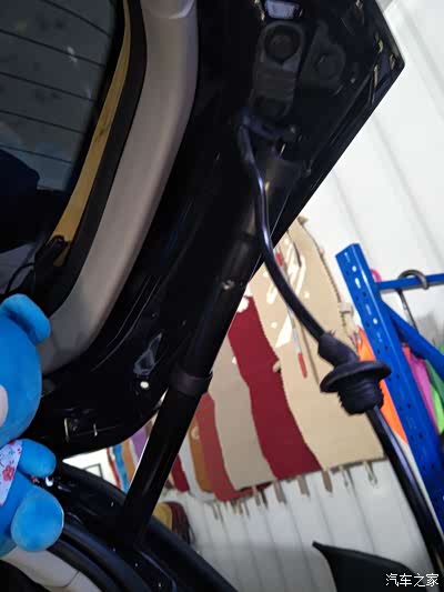 在后备箱侧面打孔走线,走的这个是电动撑杆的线,远处撑杆上的线大家可以看到吧。